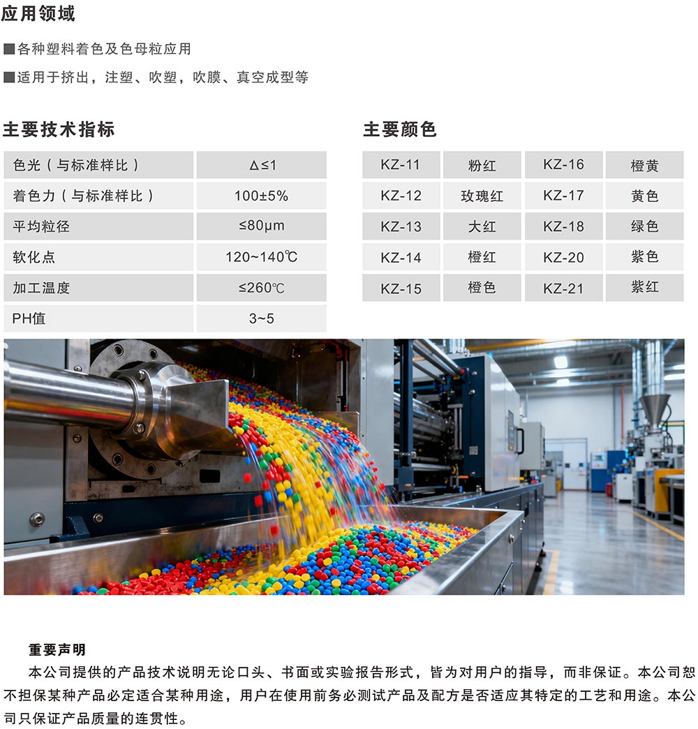 产品特点 KZ 系列荧光颜料具有较高色力,热稳定性,光稳定性和良好的兼容性,可供多种塑料加工并赋予良好的机械性能,荧光度强,分散性能良好,在加工过程中无甲醛气体排放且不粘螺杆,易清洗。特别推荐用于注塑、吹塑、吹膜、挤膜、压延膜、挤出、挤片、真空成型等工艺。
